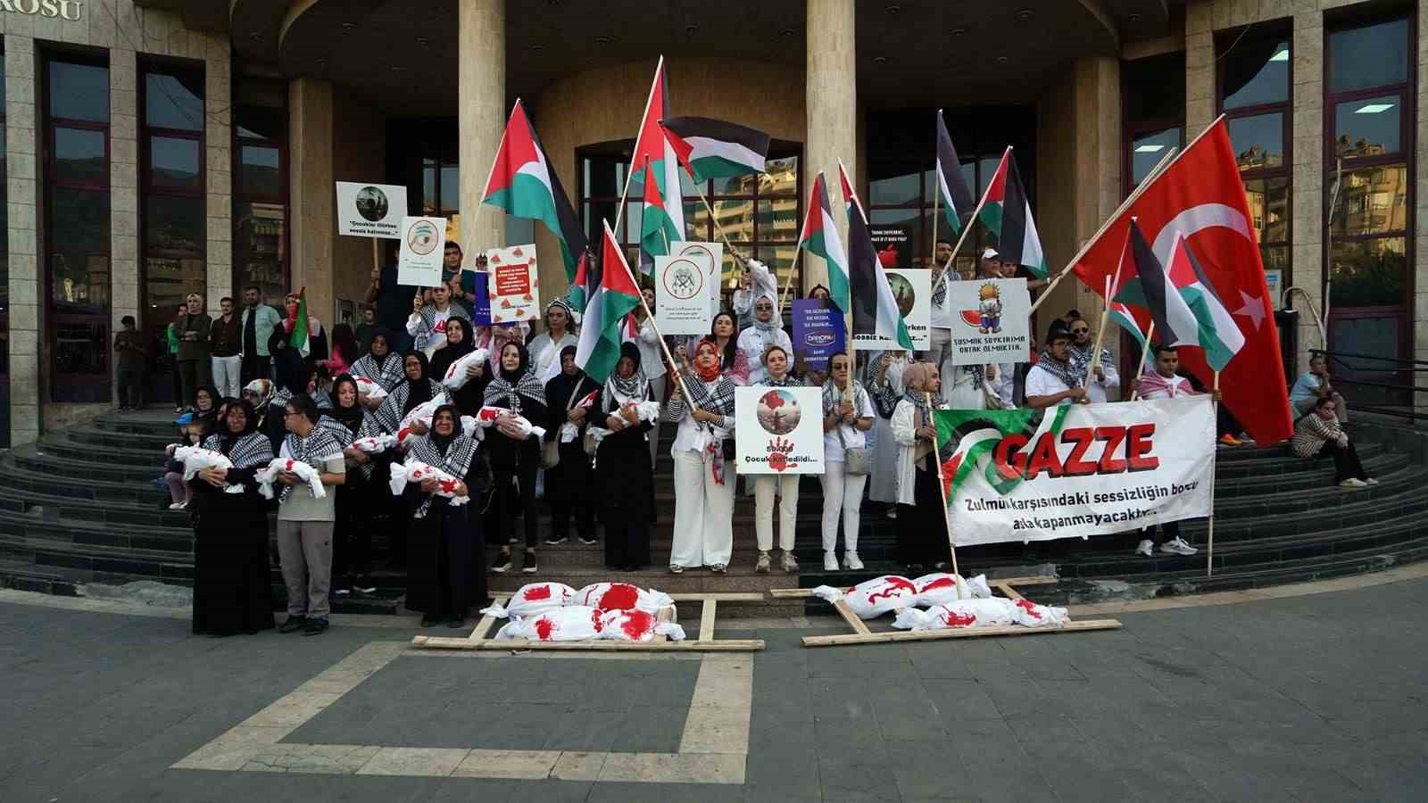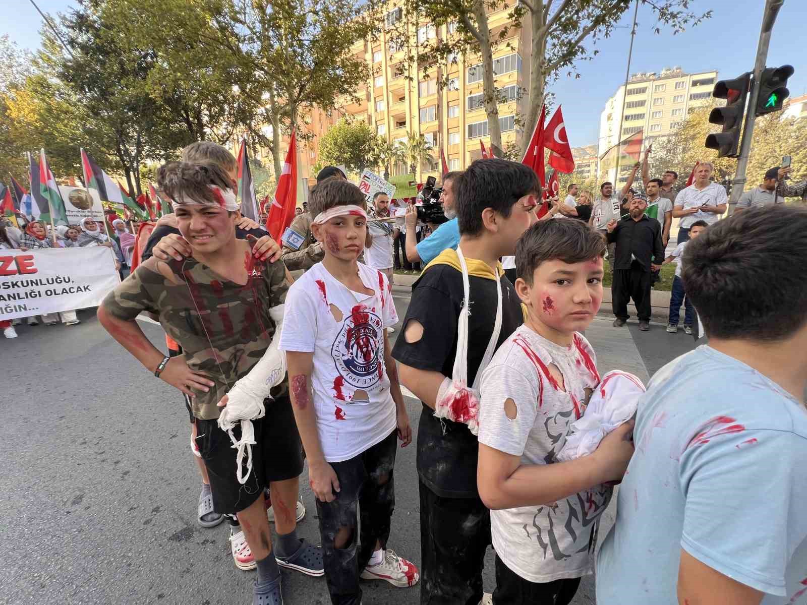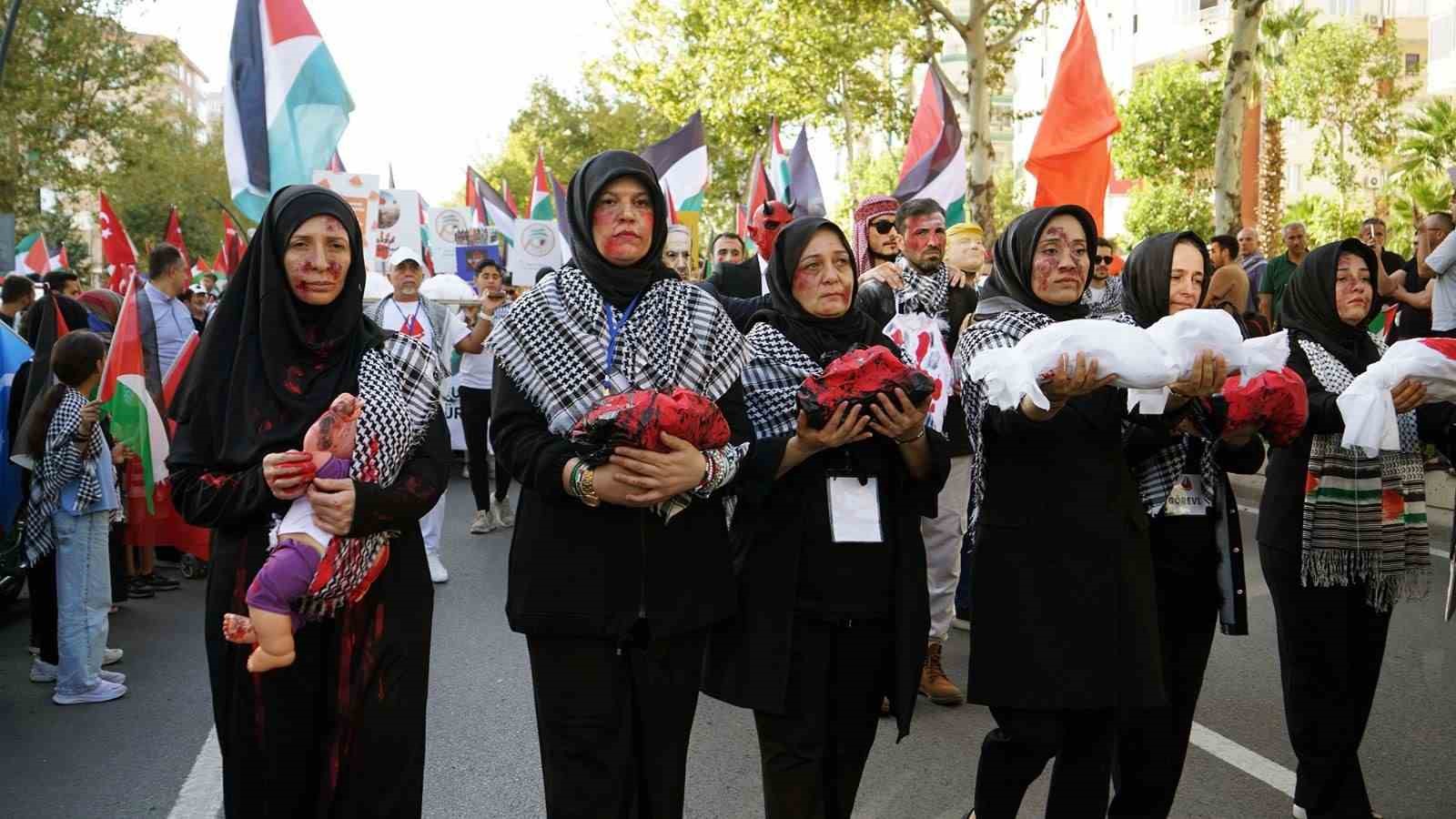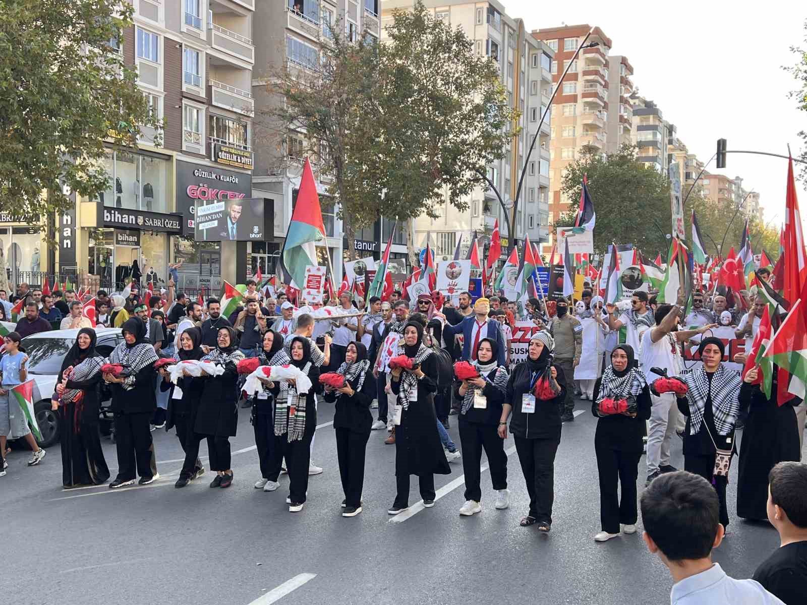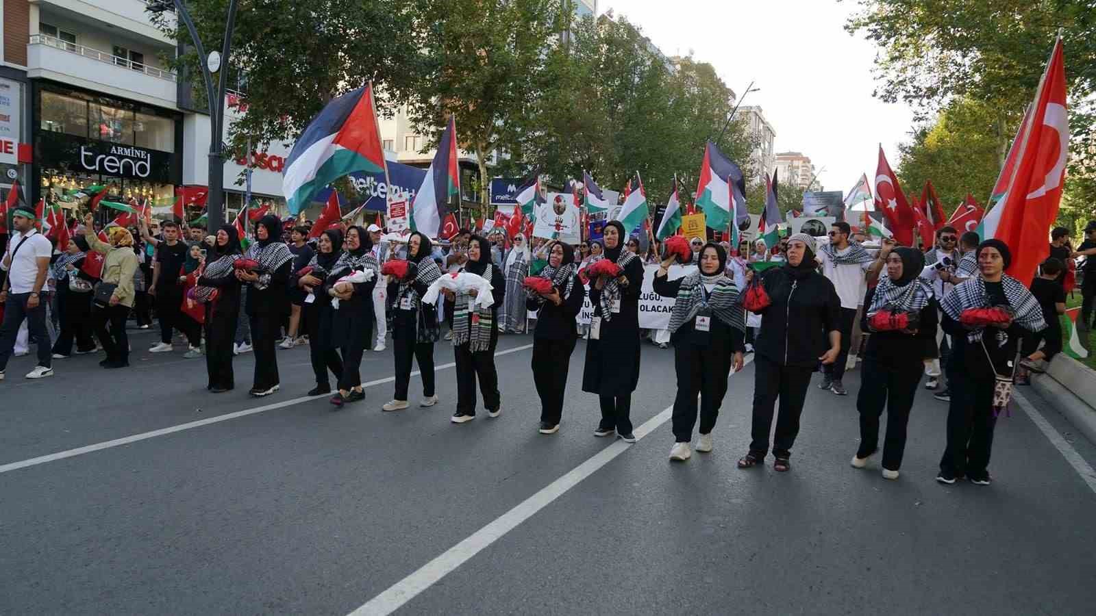 Ellerinde Türk ve Filistin bayrakları ile Alparslan Türkeş Bulvarı’nda toplanan vatandaşlar, Necip Fazıl Kültür Merkezi önüne kadar yürüdü. Yürüyüşte Büyükşehir Belediyesi bayrakları ücretsiz dağıttı. ABD Başkanı Trump ve İsrail Başbakanı Netanyahu maskesi takan bazı vatandaşlar, Filistinli çocuklara yapılan zulmü canlandıran kısa bir tiyatro gösterisi sergiledi. İsrail askerlerinin Filistinli çocukları horladığı ve ezdiği sahneler, vatandaşların büyük tepkisini çekti. Yürüyüş boyunca “Kahrolsun İsrail”, “Yaşasın özgür Filistin” sloganları atılırken, sık sık tekbir sesleri yükseldi. Necip Fazıl Kültür Merkezi önünde tamamlanan programda şiirler okunarak, dualar edildi ve konuşmalar yapıldı. Program sonunda MADO tarafından vatandaşlara çeşitli ikramlarda bulunuldu.